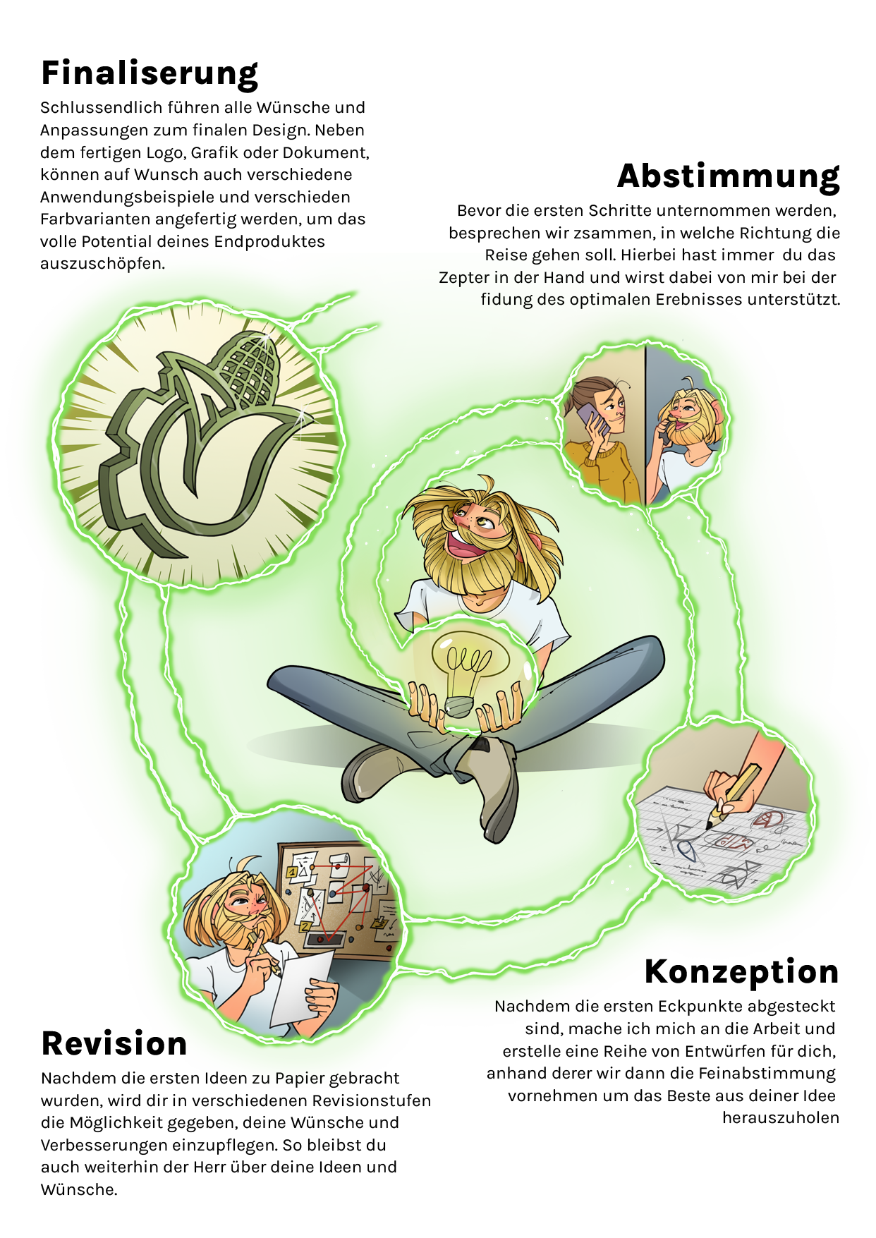 3–4 Entwürfe, 2 Korrekturen, Styleguide, alle Formate